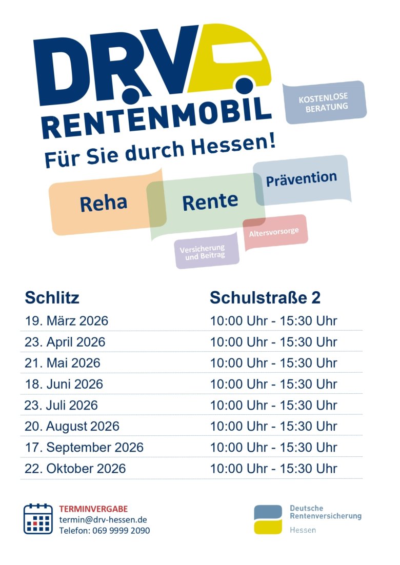 Schlitz wurde erneut in den Tourenplan des Rentenmobils der DRV (Deutschen Rentenversicherung) aufgenommen, die mit diesem Angebot insbesondere in den ländlichen Regionen eine Beratung vor Ort ermöglichen möchte.
