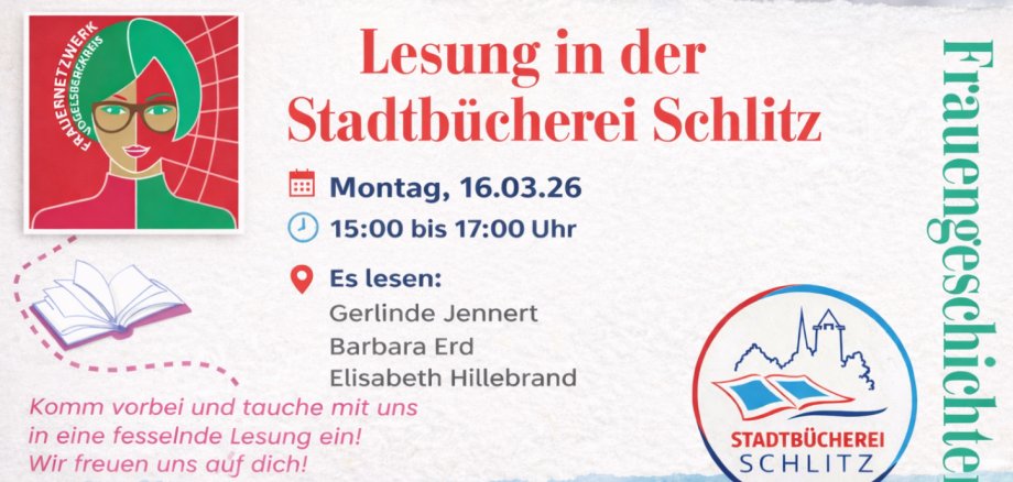 Im Rahmen der „Frauenwochen im Vogelsbergkreis“ lädt die Stadtbücherei Schlitz am Montag, 16. März 2026, von 15 bis 17 Uhr zu einer Lesung unter dem Motto „Frauengeschichten“ ein. Die Veranstaltung findet in den Räumen der Bücherei in der Schulstraße 2 in Schlitz statt.